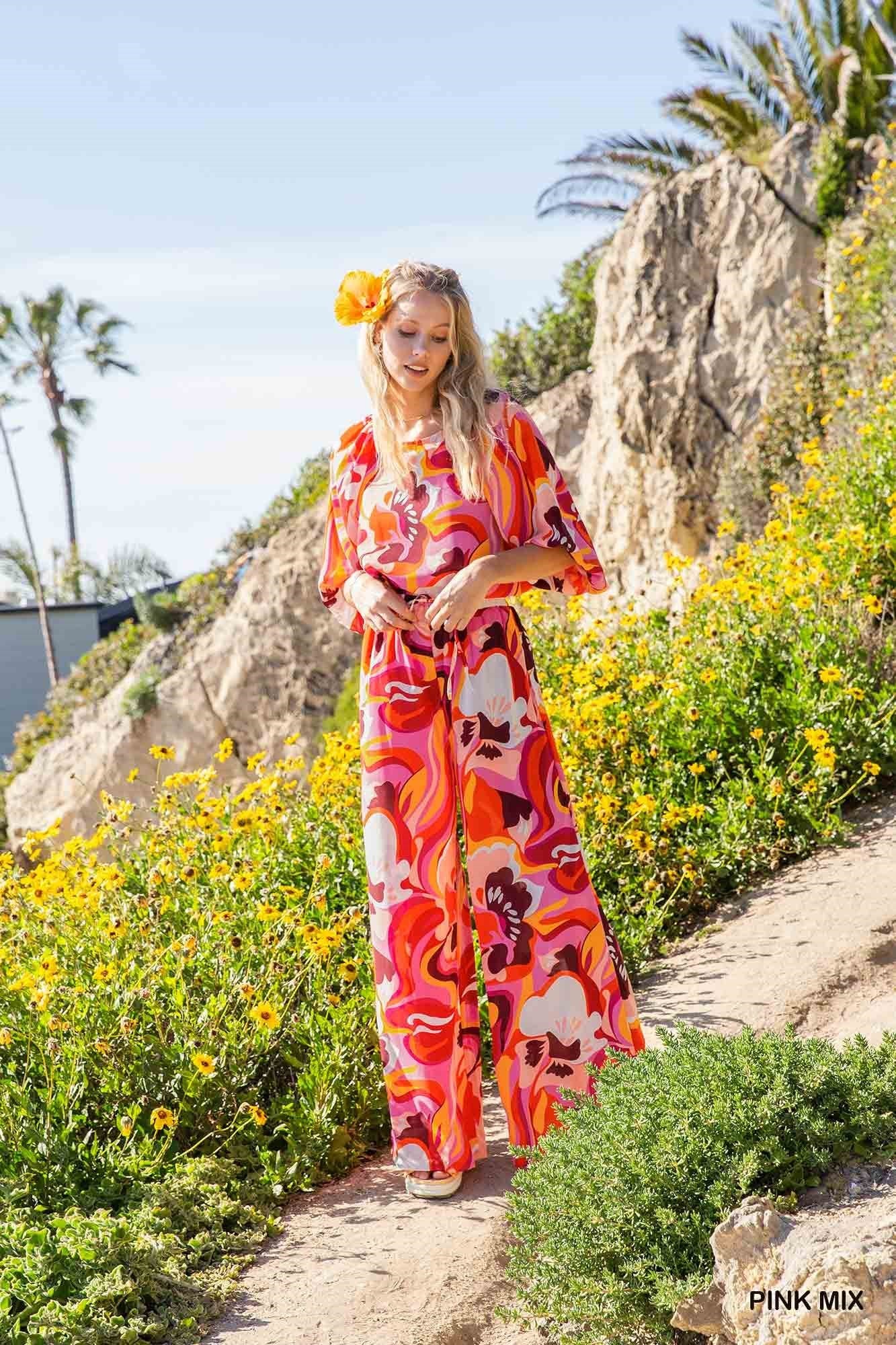 Pink Abstract Print Wide Leg Pants