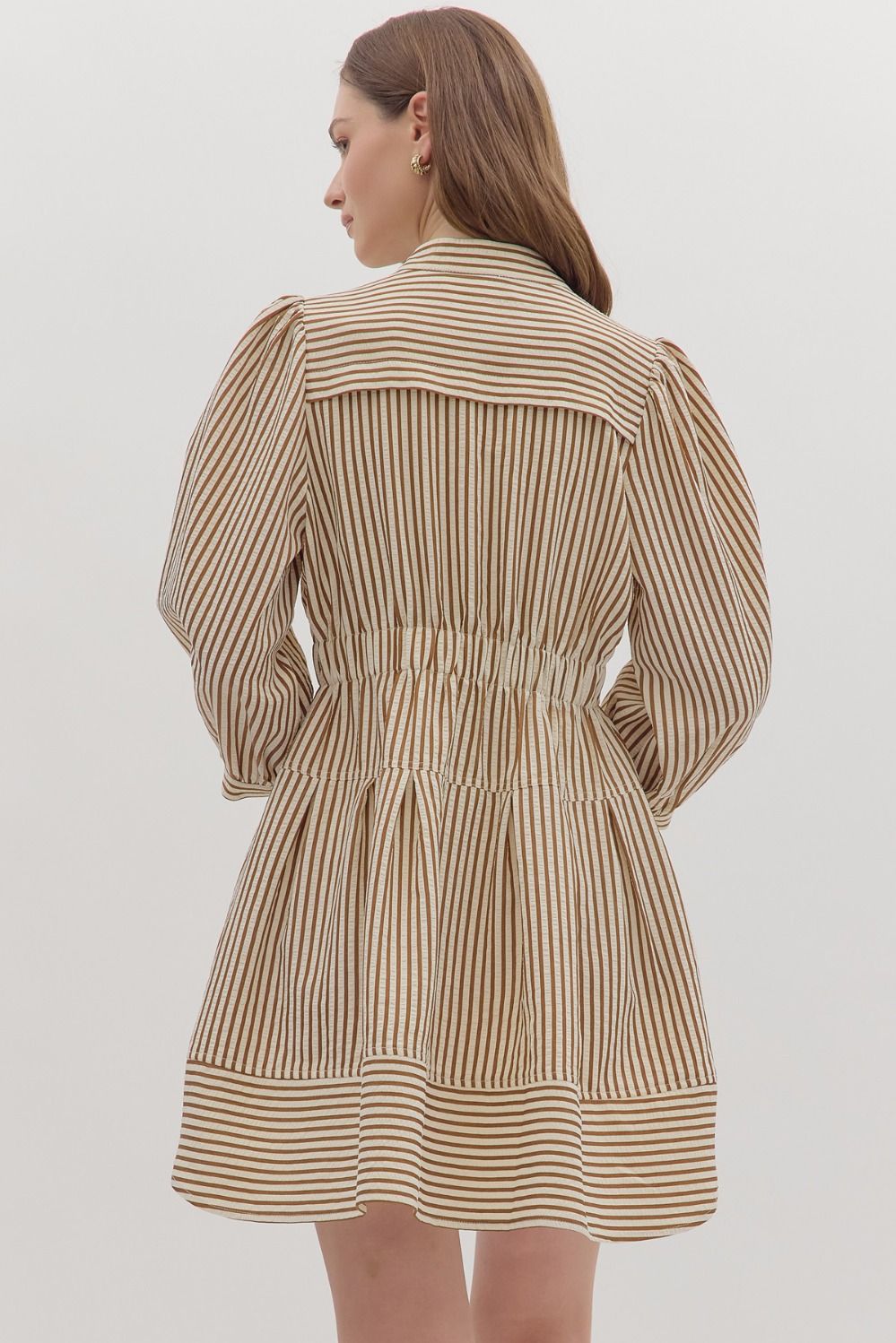 Striped 3/4 puff sleeve mini dress featuring front chest pocket and elasticated waist. Button closure at front. Pocket at side.
