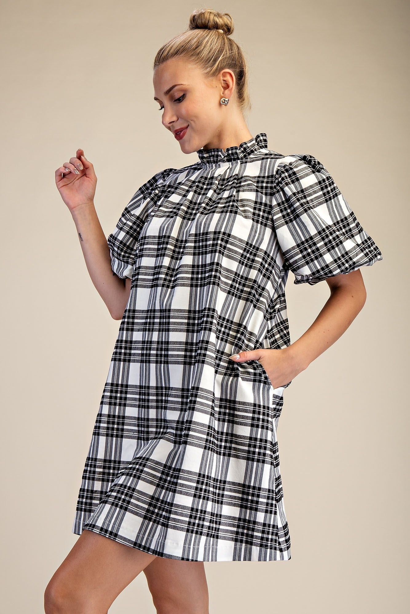 Plaid Print Ruffle Neck Puff Sleeve Mini Dress