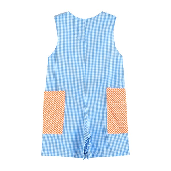 Sweet and classic. This applique romper in blue gingham features a cute bunny in a wagon. Perfect for Easter and adorable in photos. Offset orange gingham pockets and fabric wrapped buttons are a quality finish and a signature of Lil Cactus.