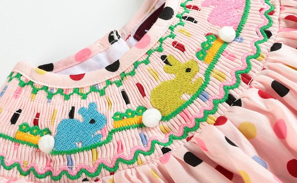 Absolutely adorable. Sweet Polka Dots and cute bunnies on smocking with pom pom tails. Gorgeous fabric and detail.
