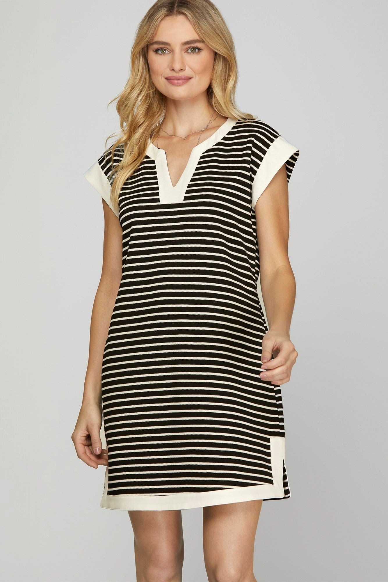 Drop Shoulder Contrast Band Striped Dress with Pockets
