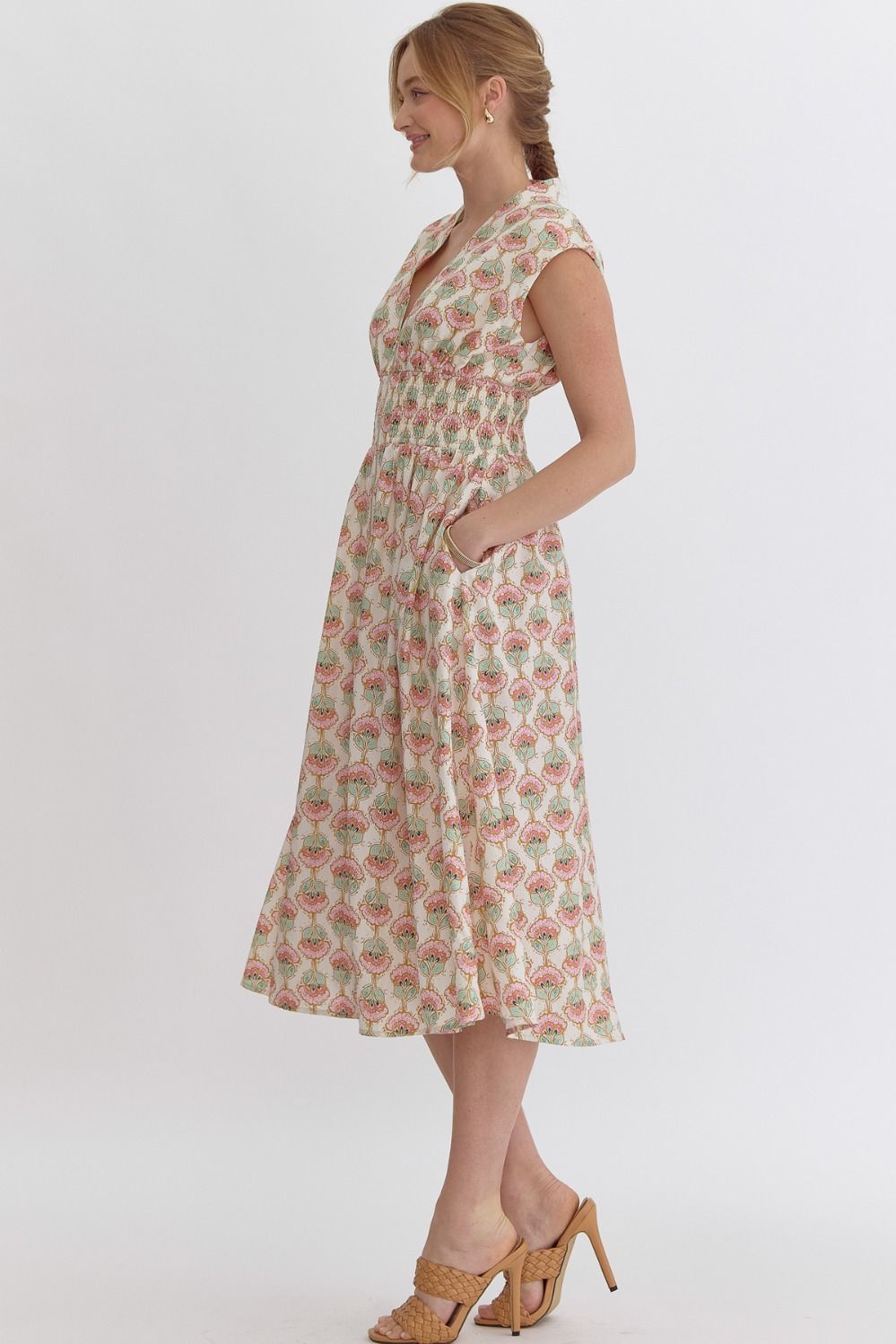 Printed v-neck sleeveless midi dress featuring dual zipper at front. Smocking at waist and pocket at sides.