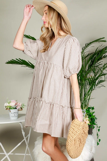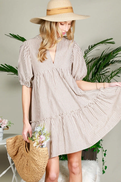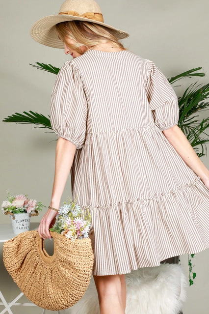 V-neck Striped Short Puff Sleeve Cotton Dres