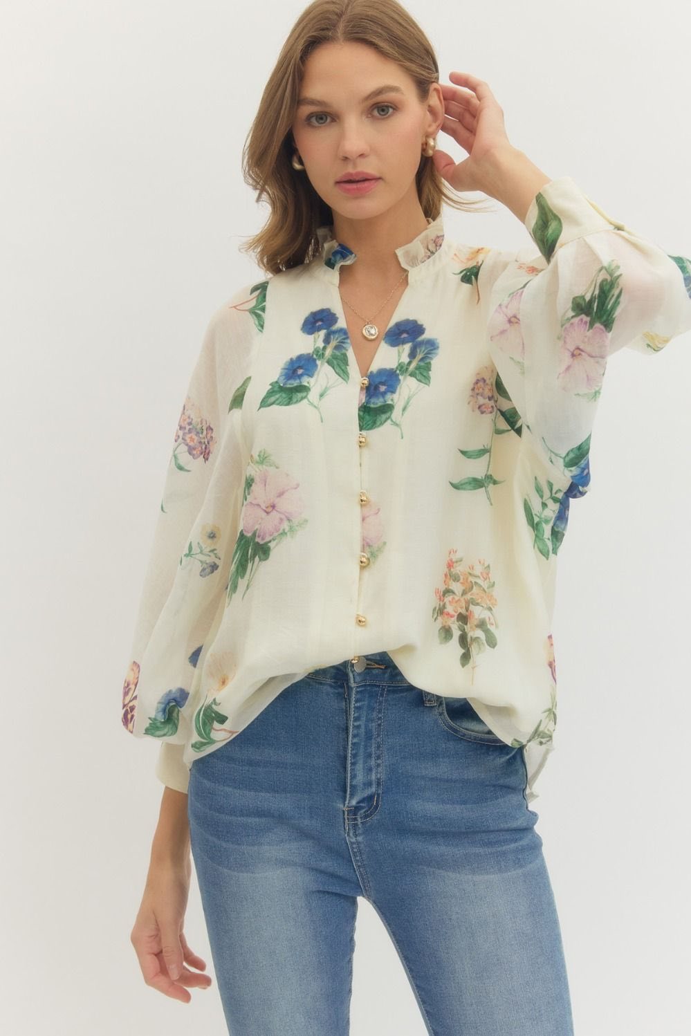 Floral print long puff sleeve top featuring ruffled neck and button closure at front. Buttoned cuffs.