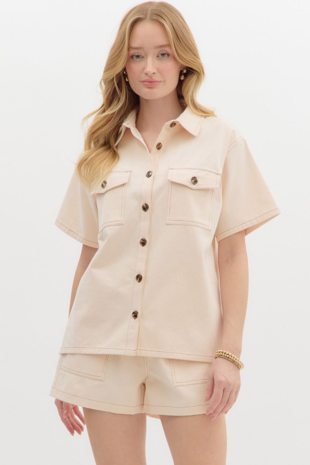 Solid short collared button closure oversized top featuring slit hem. Double shirt pockets with functional button closure flaps.