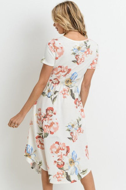 Short Sleeve Round Neck Floral Midi Dress with Side Pockets