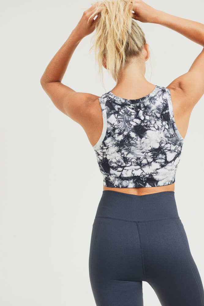 This seamless, tie-dyed sports bra has the perfect coverage in the front and back. It has a racerback design, a rounded neckline, and has an all-over ribbing.